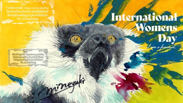 3月8日 International Womens Day (国際女性デー) 記念絵。クロシロエリマキキツネザルを描いた理由は、この動物にメス優位の女系社会で群れ生活する習性がある為。(人間のイメージする”動物”より、実際の動物はもっと多様で柔軟な生き方をしている場合も多い) 女性の権利が正当に行使され、地位向上・女性差別の払拭がなされる社会実現の為に、今後も微力ながら活動を続ける意思表明も込めて […]
