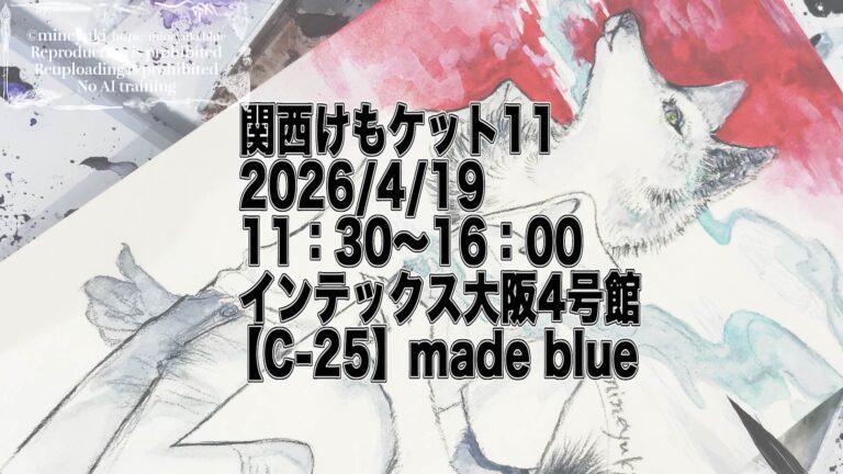 関西けもケット11 https://skypalette.jp/kemoket/2026/4/1911:30~16:00インテックス大阪4号館【C-25】made blue 出展させていただきます。よろしくお願いいたします…! 蝋引きブックカバー、画集、アートポスター、レターセット・便箋、ポストカードetc…を販売予定。 絵画『グレイス』紫煙燻らせる人狼女子 新作色紙墨絵です。 画集 […]